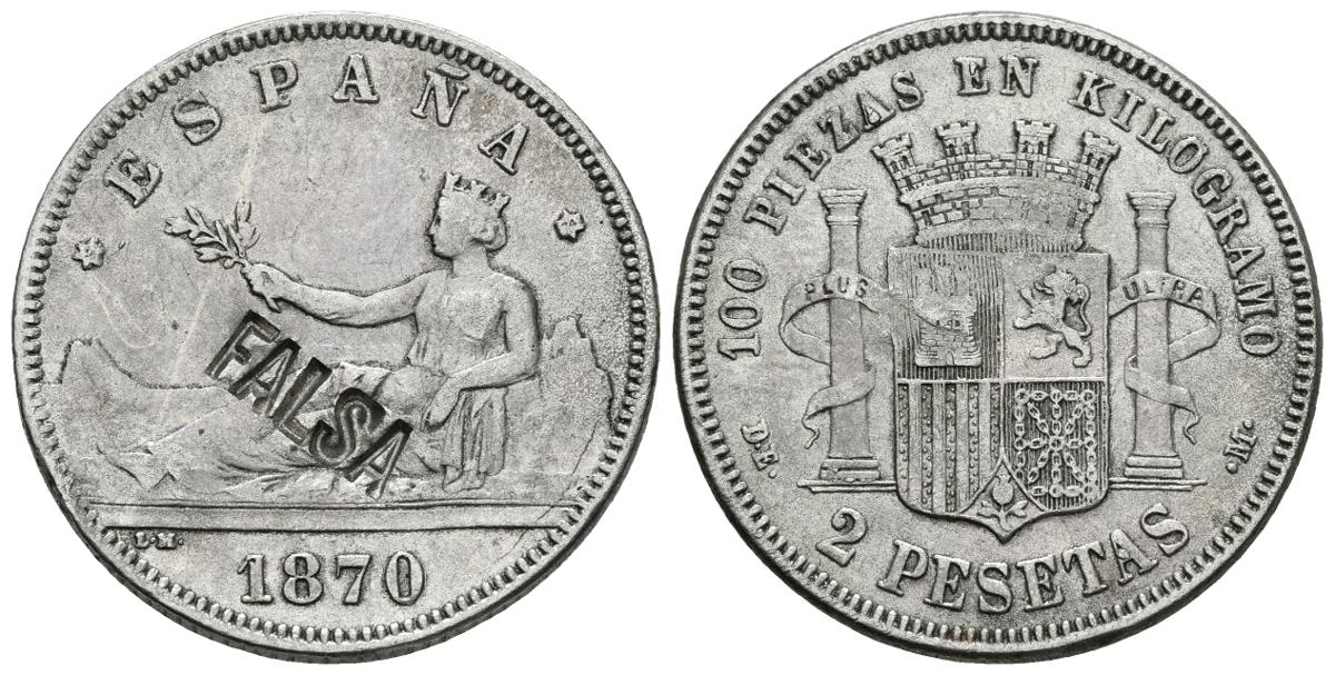 GOBIERNO PROVISIONAL. 2 Pesetas. 1870 *18-74. Madrid DEM. Falsa de época, retirada por el banco de España y marcada con FALSA. Cal-10 (Falsa). Metal blanco. 7,16g. MBC+.