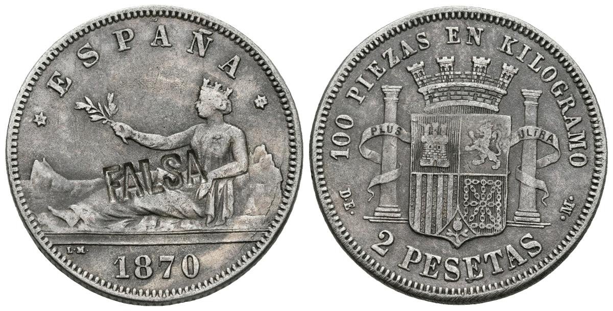 GOBIERNO PROVISIONAL. 2 Pesetas. 1870 *18-74. Madrid DEM. Falsa de época, retirada por el banco de España y marcada con FALSA. Cal-10 (Falsa). Metal blanco. 7,43g. MBC+.