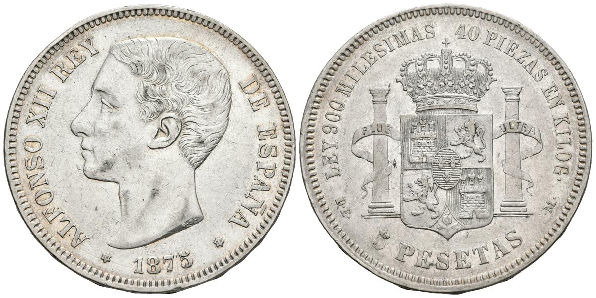 ALFONSO XII. 5 Pesetas. 1875 *18-78. Madrid DEM. Cal-29. Ar. 25,07g. Marquitas. MBC.