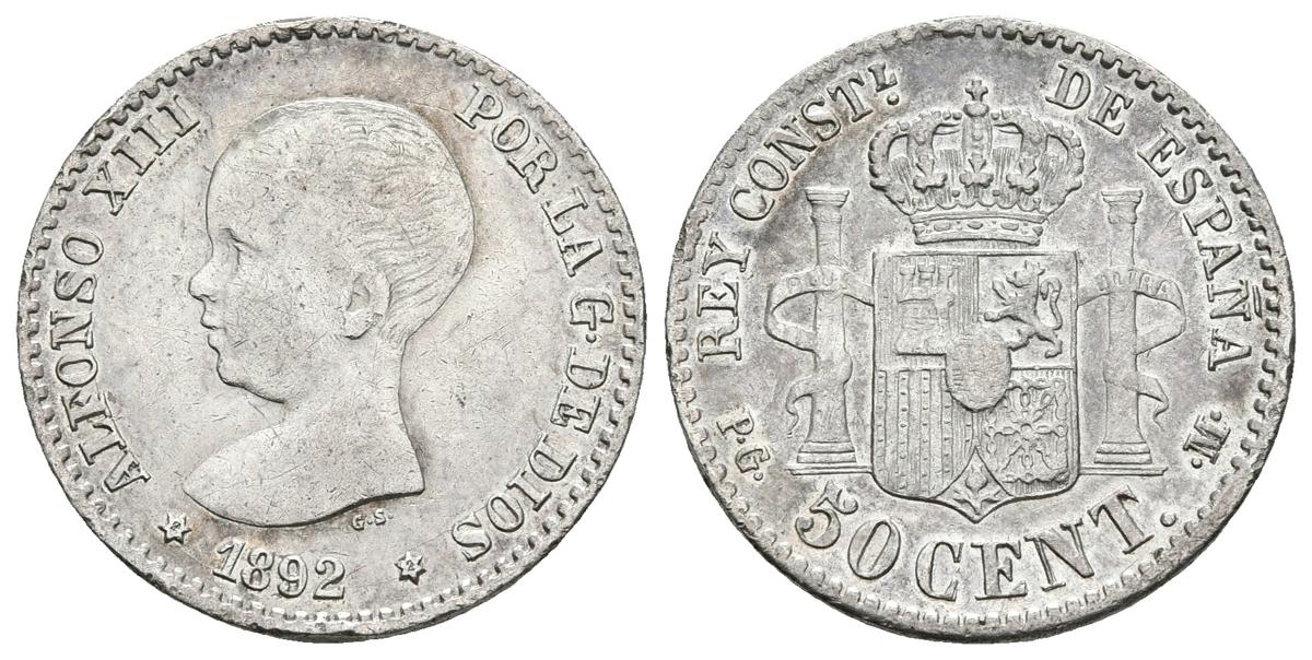 ALFONSO XIII. 50 Céntimos. 1892 *2-2. Madrid PGM. Cal-56. Ar. 2,46g. MBC. Escasa.