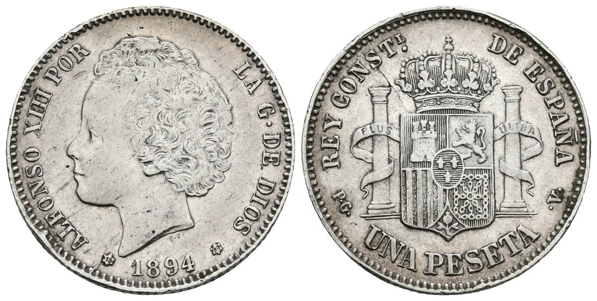 ALFONSO XIII. 1 Peseta. 1894 *18-94. Madrid PGV. Cal-40. Ar. 4,99g. Golpecitos en el canto. MBC+. Escasa.