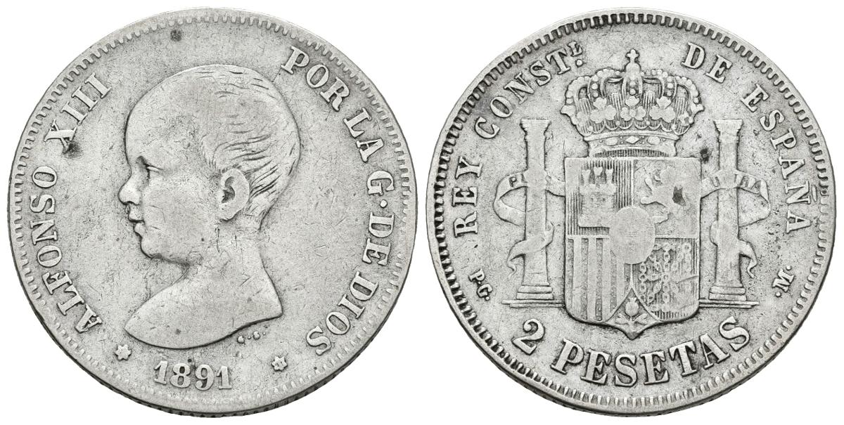 ALFONSO XIII. 2 Pesetas. 1891 *1_-91. Madrid PGM. Cal-31. Ar. 9,69g. Estrellas algo tenues. BC. Rara.