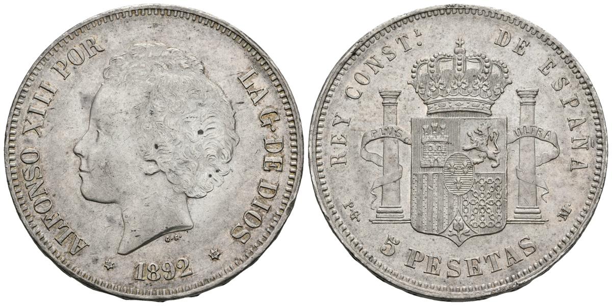 ALFONSO XIII. 5 Pesetas. 1892 *18-92. Madrid PGM. Cal-19. Ar. 24,92g. MBC+.
