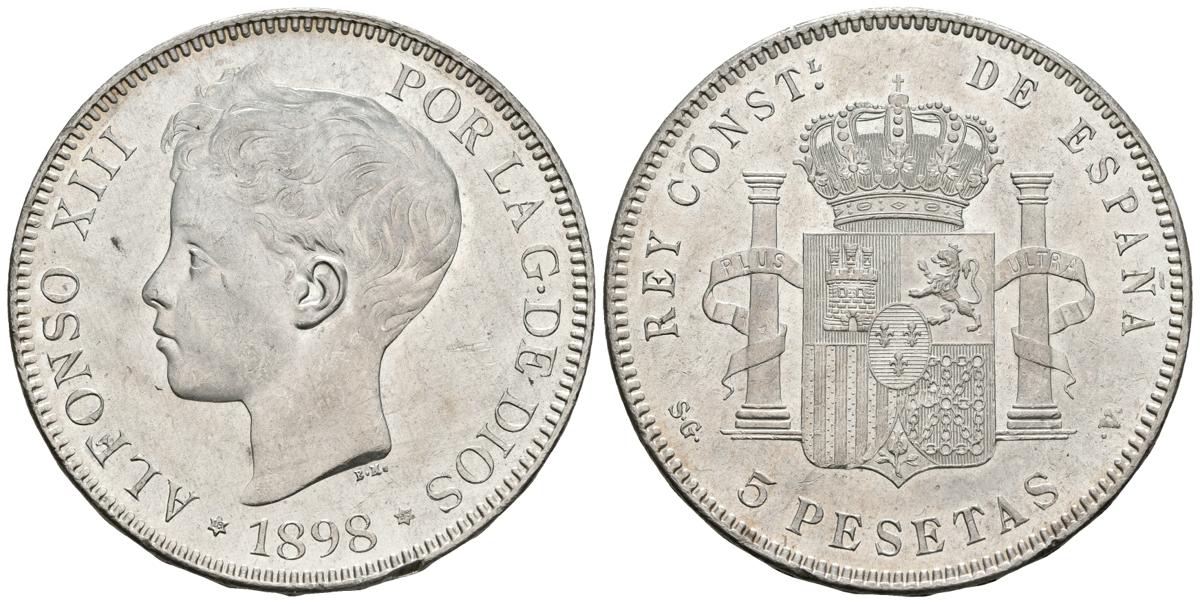 ALFONSO XIII. 5 Pesetas. 1898 *18-98. Madrid SGV. Cal-27. Ar. 25,01g. Marquitas. EBC+.