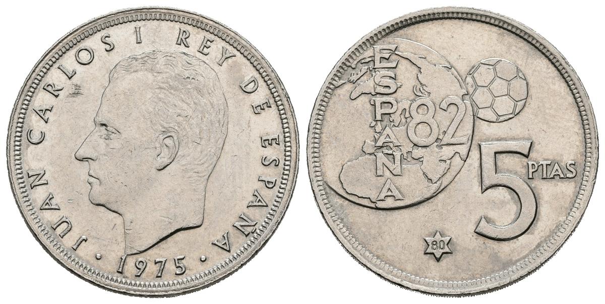 JUAN CARLOS I. 5 Pesetas. 1975 *80. ERROR del Mundial. Cal-124. Cu-Ni. 5,73g. Marquitas. MBC+.