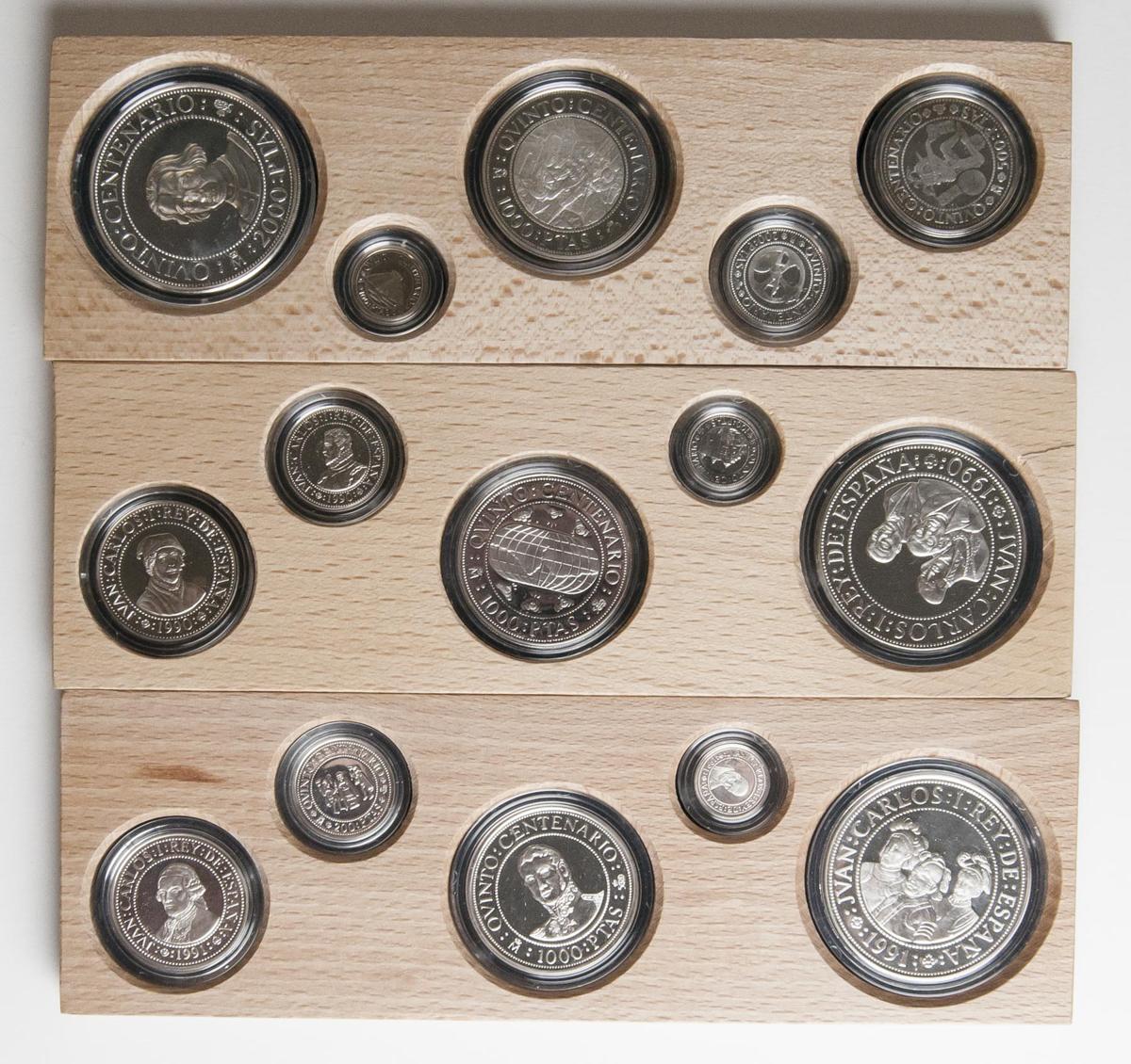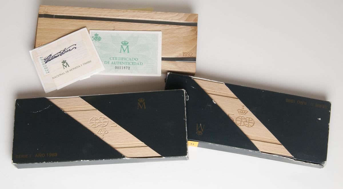 JUAN CARLOS I. Lote compuesto por 3 estuches oficiales con las series de 100, 200, 500, 1000 y 5000 Pesetas de los años 1989, 1990 y 1991. Ar. PROOF.