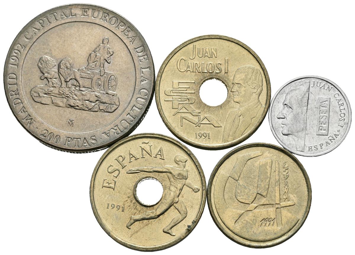 JUAN CARLOS I. Serie completa. 1, 5, 25 (2) y 200 Pesetas. 1991. Madrid. Ar/Cu-Ni. SC+.