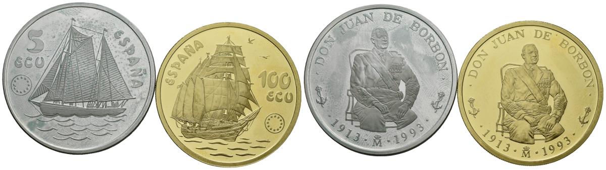 CONTEMPORANEO. Conjunto de 2 monedas de Ecu, conteniendo: 100 Ecu. 1993. Madrid. Au. 34,55g; 5 Ecu. 1993. Madrid. Ar. 33,62g. PROOF. Las 2 monedas con certificado de la FNMT y sin estuche oficial.