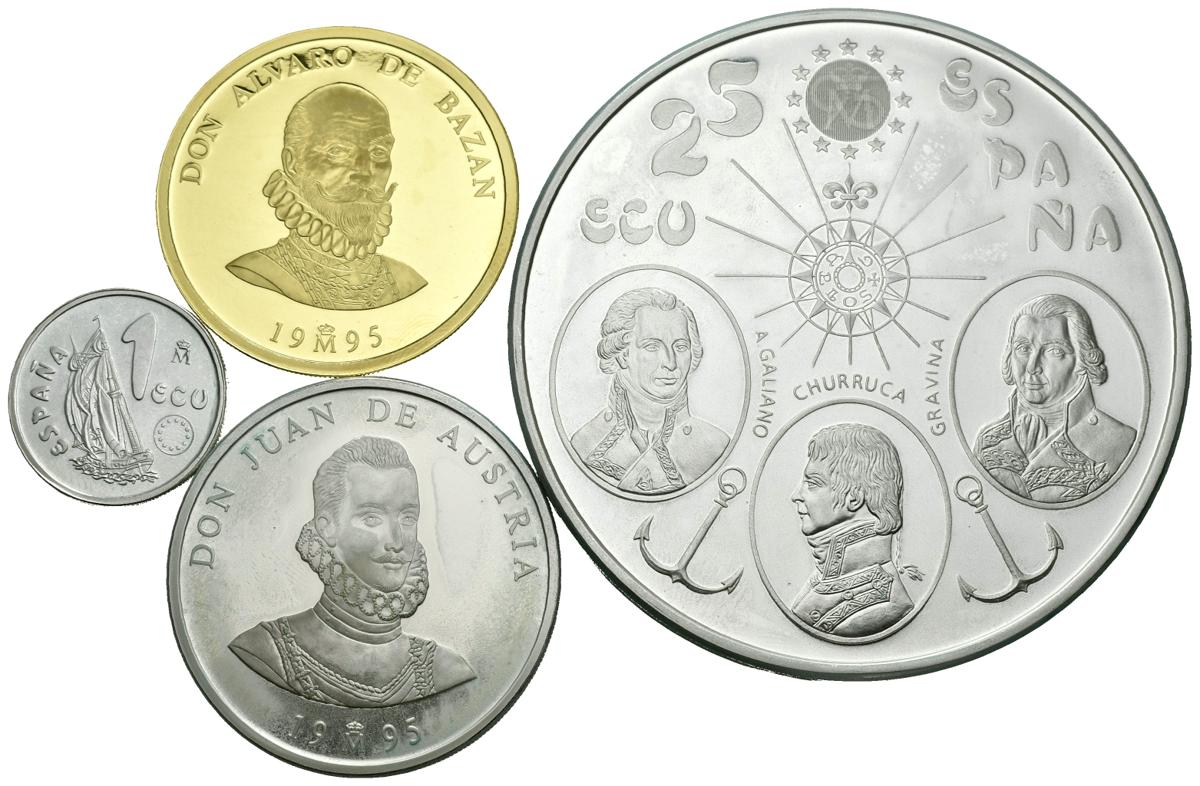 CONTEMPORANEO. Serie completa conmemorativa de la Marina Española. 1, 5, 25 y 100 Ecu. 1995. Madrid. Ar. 209,09g y Au. 34,55g. PROOF. Todas las monedas con sus respectivos certificados excepto los 100 Ecus de oro, todas las monedas sin estuche oficial.
