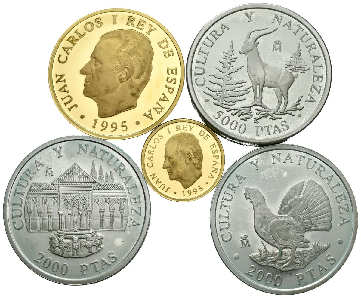CONTEMPORANEO. Serie completa conmemorativa Cultura y Naturaleza. 2000 (2), 5000, 10000, 20000 y 80000 Pesetas. 1995. Madrid. Ar. 276,75g y Au. 33,75g. PROOF. Todas las monedas sin certificado de la FNMT y sin estuche oficial.