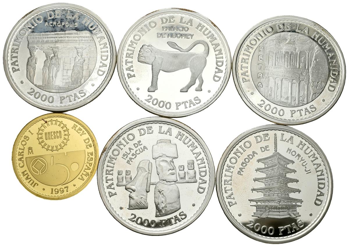 CONTEMPORANEO. Serie completa conmemorativa del 50º Aniversario de la UNESCO. 2000 (5) y 40000 Pesetas. 1997. Madrid. Ar. 135g y Au. 13,50g. PROOF. Todas las monedas con certificado de la FNMT y sin estar presentadas en estuche oficial.