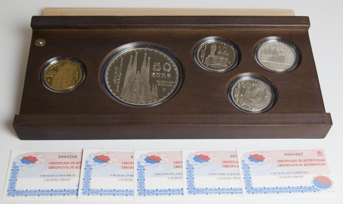 CONTEMPORANEO. Serie completa conmemorativa de Gaudí. 10 (3), 50 y 400 Euros. 2002. Madrid. Ar. 249,75g y Au. 27,00g. PROOF. Todas las monedas con certificados y estuche oficiales.