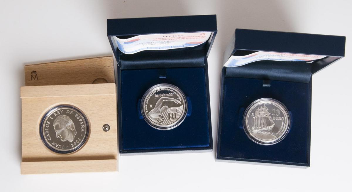 CONTEMPORANEO. Conjunto de 3 monedas de 10 Euros conmemorativas de: El 500 Aniversario del Nacimiento de Miguel López de Legazpi. 2003. Madrid. Ar. 81,00g. PROOF. Todas las monedas en sus estuches oficiales y con sus respectivos certificados de la F.N.M.T.