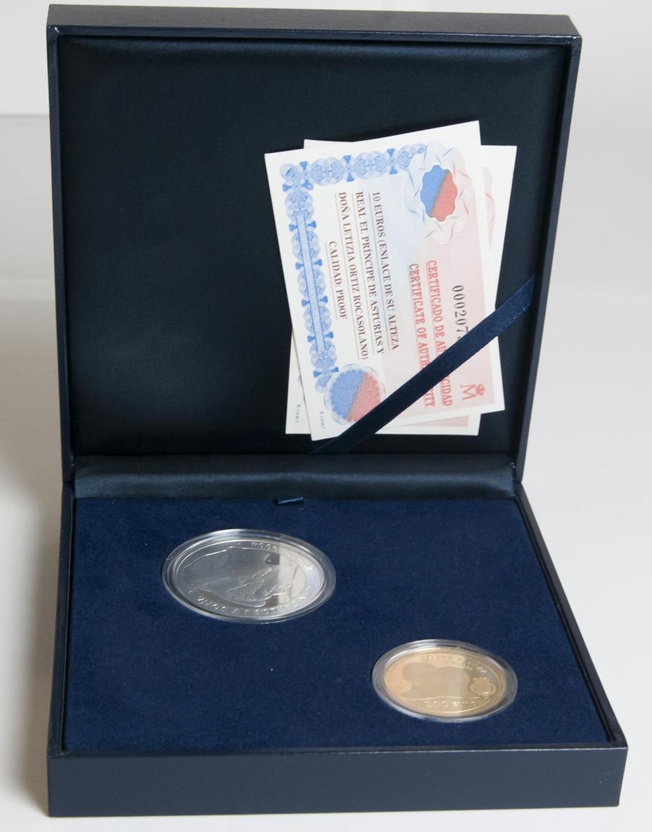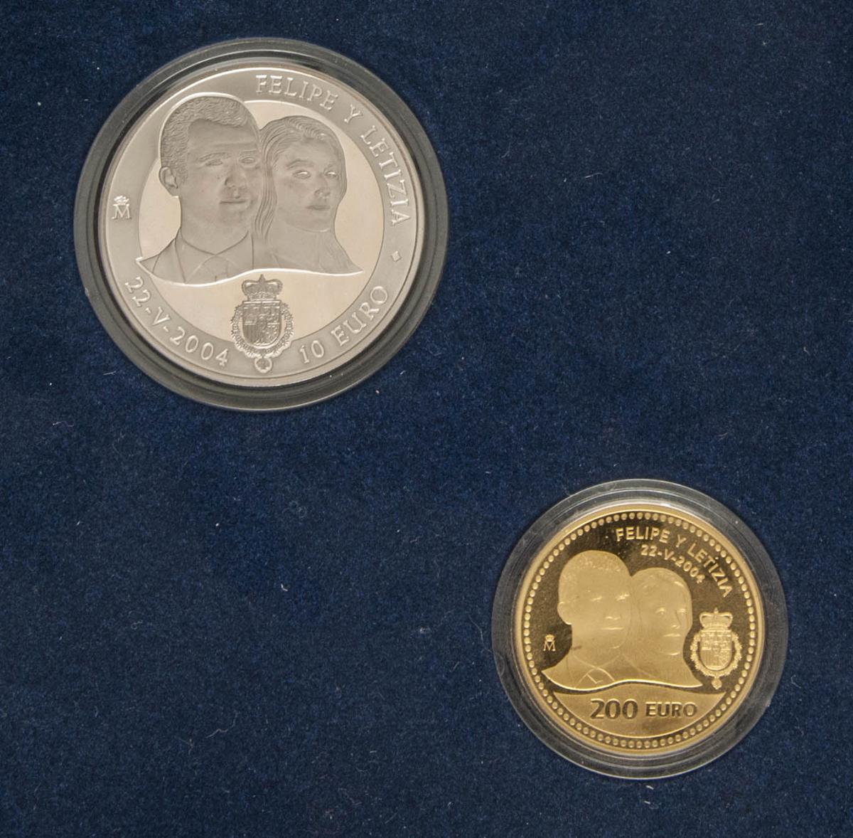 CONTEMPORANEO. Serie completa conmemorativa de la Boda del Príncipe de Austria. 10 y 200 Euros. 2004. Madrid. Ar. 27,00g y Au. 13,50g. PROOF. Todas las monedas presentadas en estuche oficial y con certificados de la F.N.M.T.
