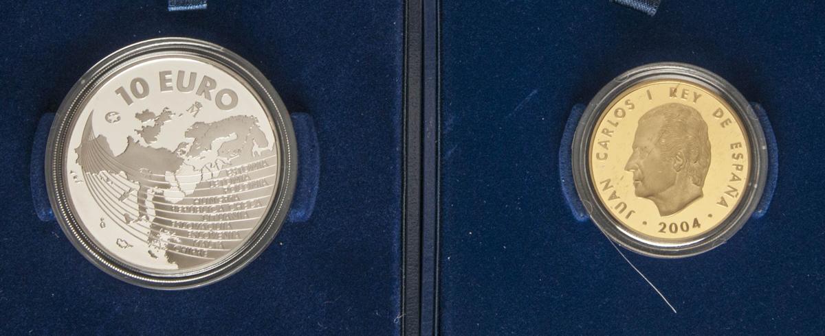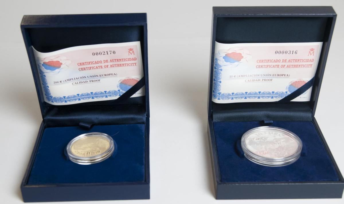 CONTEMPORANEO. Serie completa conmemorativa de la Ampliación de la Unión Europea. 10 y 200 Euros. 2004. Madrid. Ar. 27,00g y Au. 13,50g. PROOF. Todas las monedas presentadas en estuches oficiales y con certfificados de la F.N.M.T.