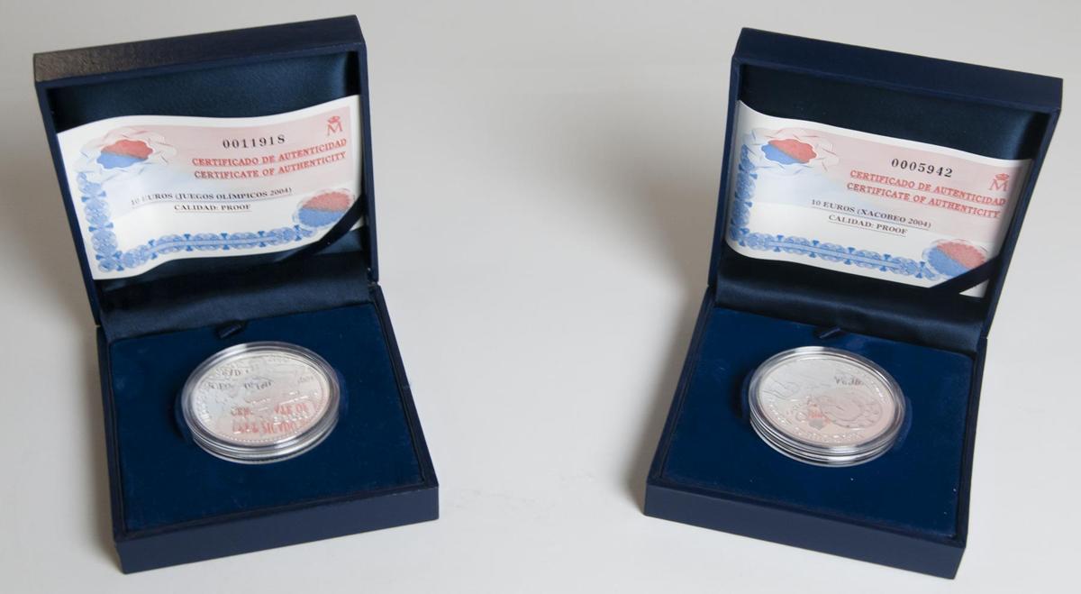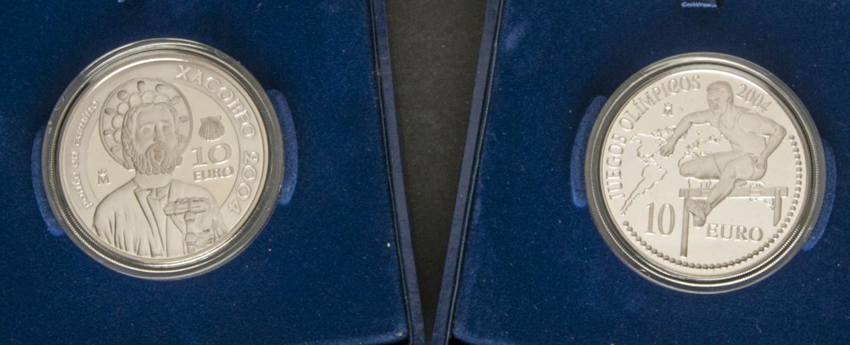 CONTEMPORANEO. Conjunto de 2 monedas de 10 Euros conmemorativas de: los Juegos Olímpicos y el Año Santo Compostelano. 2004. Madrid. Ar. 54,00g. PROOF. Todas las monedas presentadas en estuche oficial y con sus certificados de la F.N.M.T.
