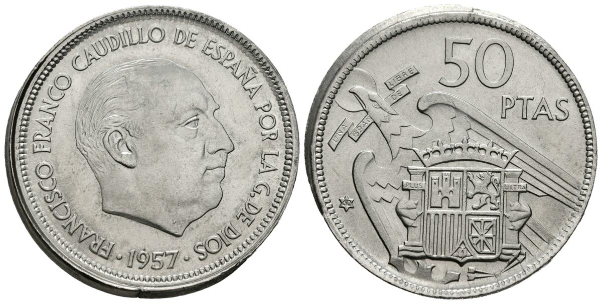 ESTADO ESPAÑOL. 50 Pesetas. 1957 *60. Error de acuñación en el canto, gran rebaba de metal. 12,64g. EBC. Rara.