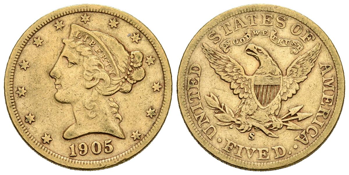ESTADOS UNIDOS. 5 Dollars. 1905. San Francisco S. Km#101; Fr. 145. Au. 8,25g. MBC-