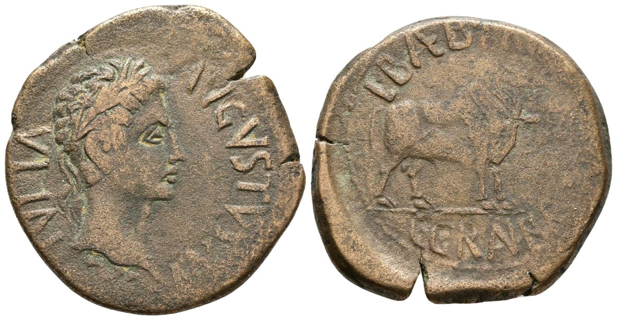CALAGURRIS. As. Epoca de Octavio. 27 a.C.-14 d.C. Calahorra (La Rioja). A/ Cabeza laureada de Octavio a derecha. MVN. CAL. IVLIA AVGVSTVS. R/ Toro parado a derecha, delante II-VIR, alrededor L. BAEB. PRISCO. C. GRAV. BRO. FAB-416. Ae. 12,92g. MBC-.