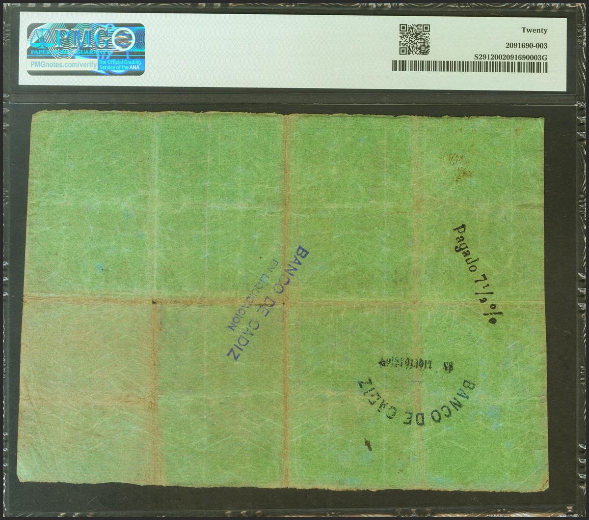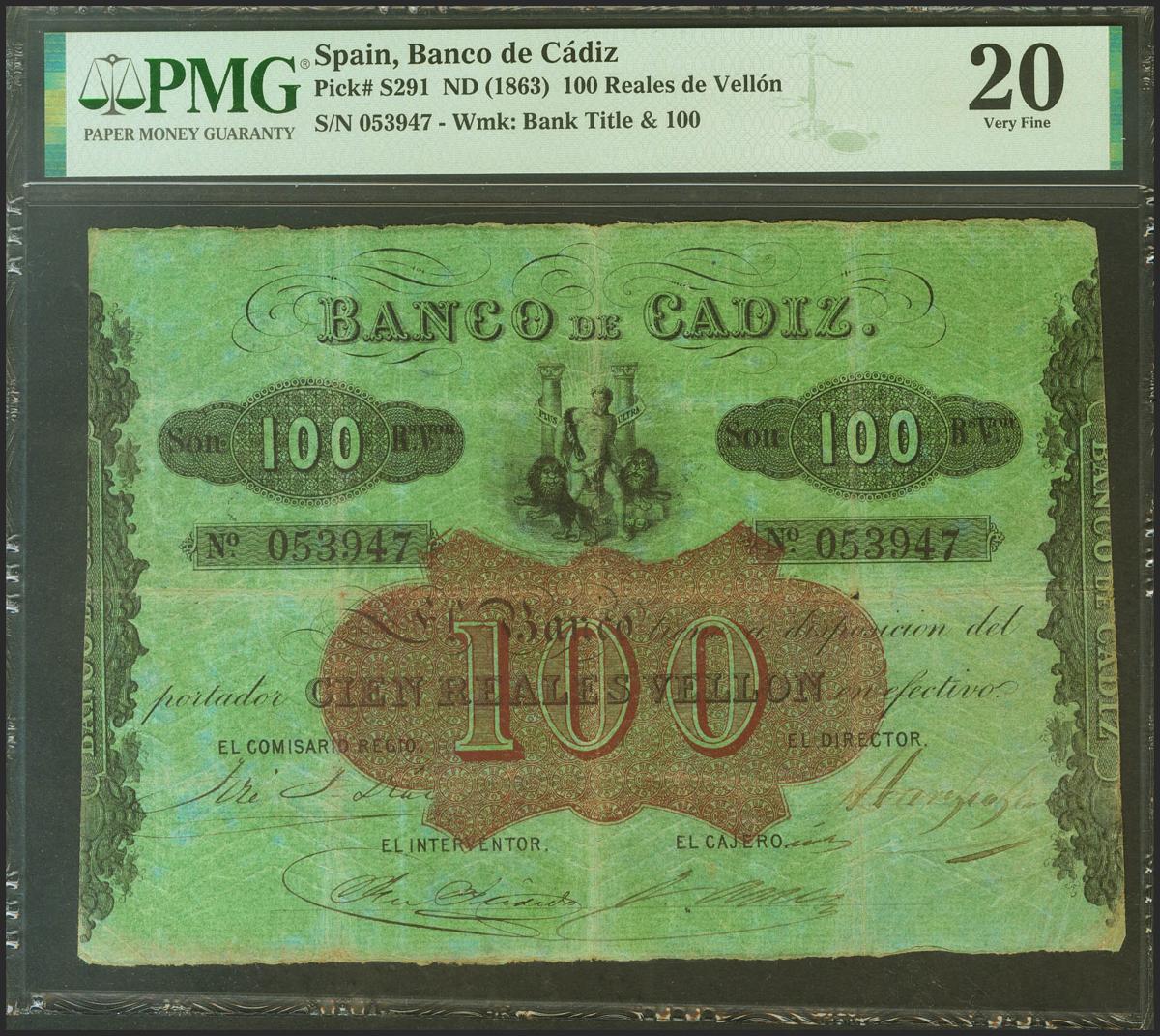 BANCO DE CADIZ. Emisión III. 100 Reales (sin fechar). Cuatro firmas y resello en seco. (Edifil 2021: 78, Pick: S291). Raro, habituales erosiones que acompañan a los dobleces. MBC+. Encapsulado PMG20.