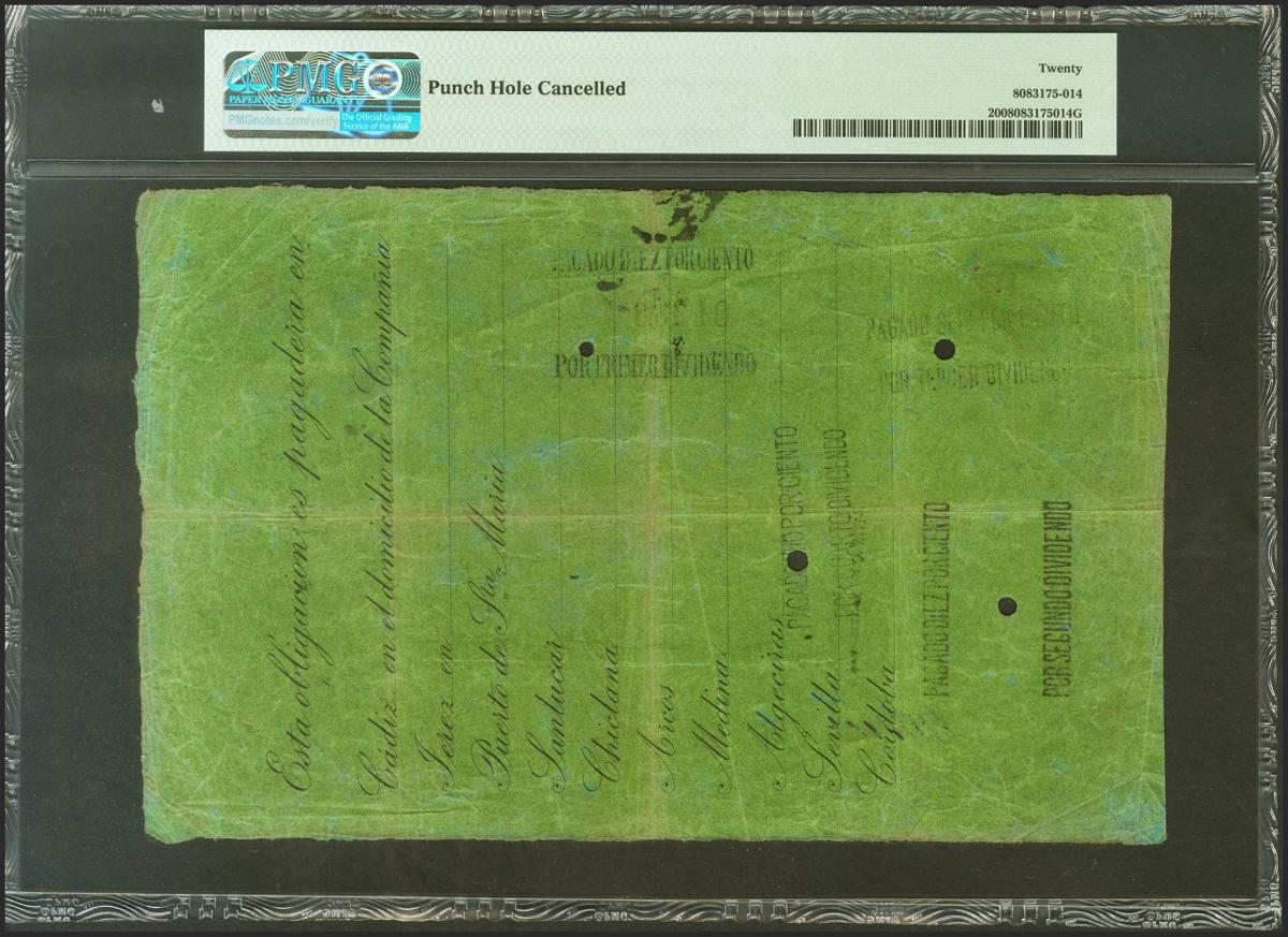 CREDITO COMERCIAL DE CADIZ. 500 Reales. 9 de Enero de 1865. Serie C y cuatro pequeños taladros. Rarísimo. Para entender mejor la contextualización de este billete recomendamos la obra "Obligaciones, vales y documentos puestos en circulación como papel moneda en España", de Don Ramón Cobo Huici. MBC+. Encapsulado PMG20.
