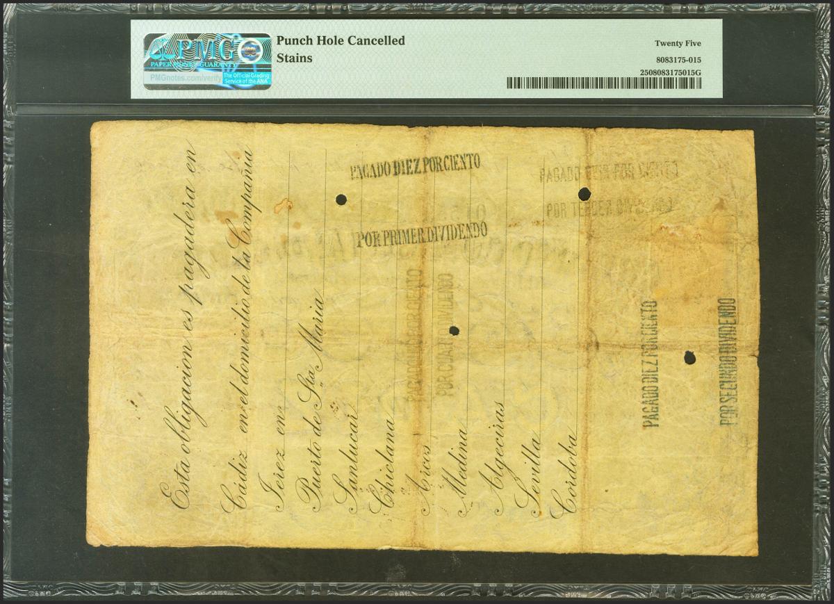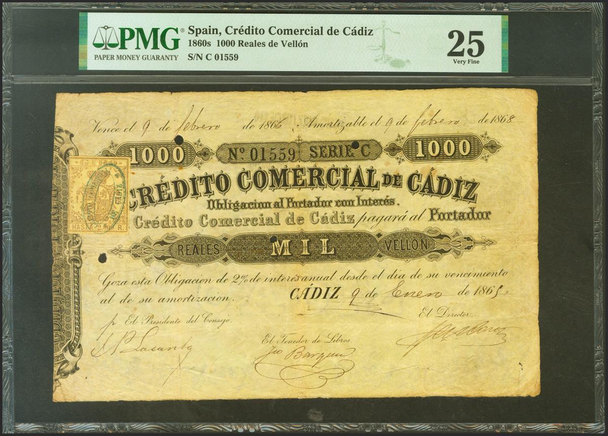 CREDITO COMERCIAL DE CADIZ. 1000 Reales. 9 de Enero de 1865. Serie C y tres pequeños taladros. Rarísimo. Para entender mejor la contextualización de este billete recomendamos la obra "Obligaciones, vales y documentos puestos en circulación como papel moneda en España", de Don Ramón Cobo Huici. MBC+. Encapsulado PMG25.
