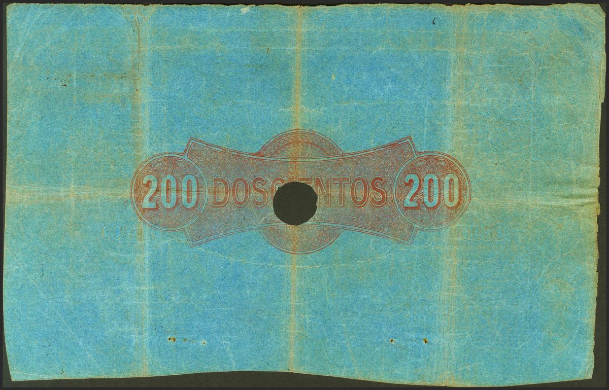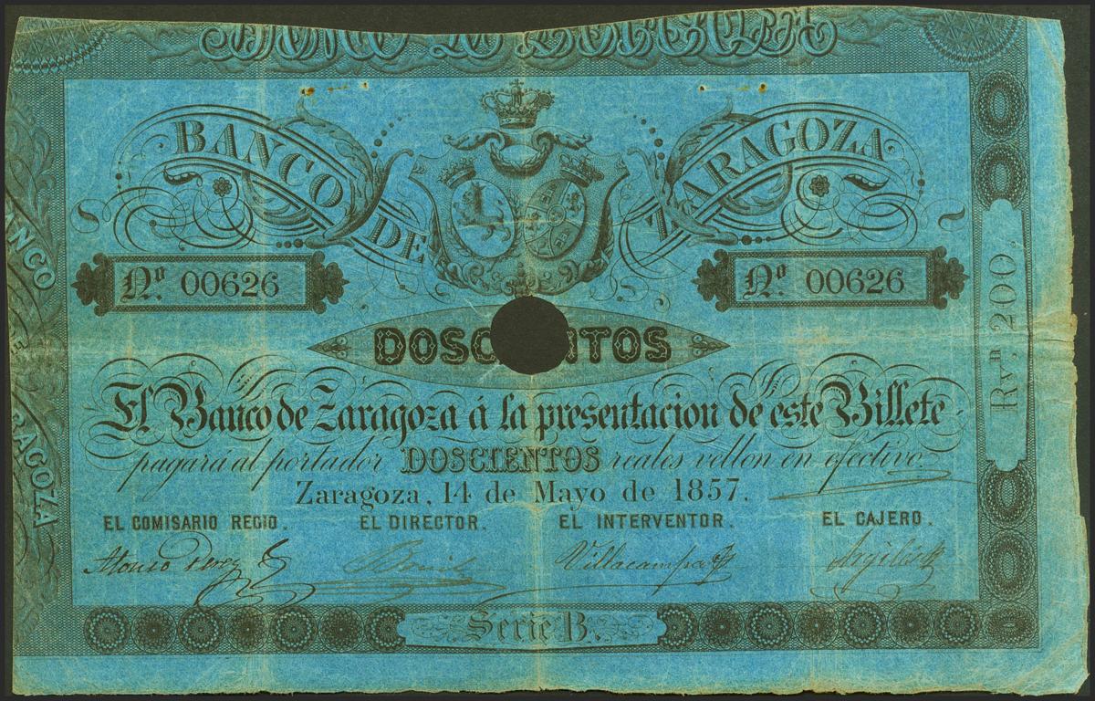 200 Reales. 14 de Mayo de 1857. Banco de Zaragoza. Serie B. Con taladro y con firmas. (Edifil 2021: 127A). Inusual, puntitos de grapas. MBC.