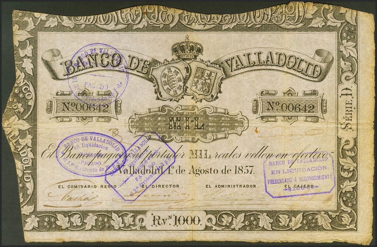 1000 Reales. 1 de Agosto de 1857. Banco de Valladolid. Serie D y numeración baja. (Edifil 2021: 134). Muy raro. MBC.