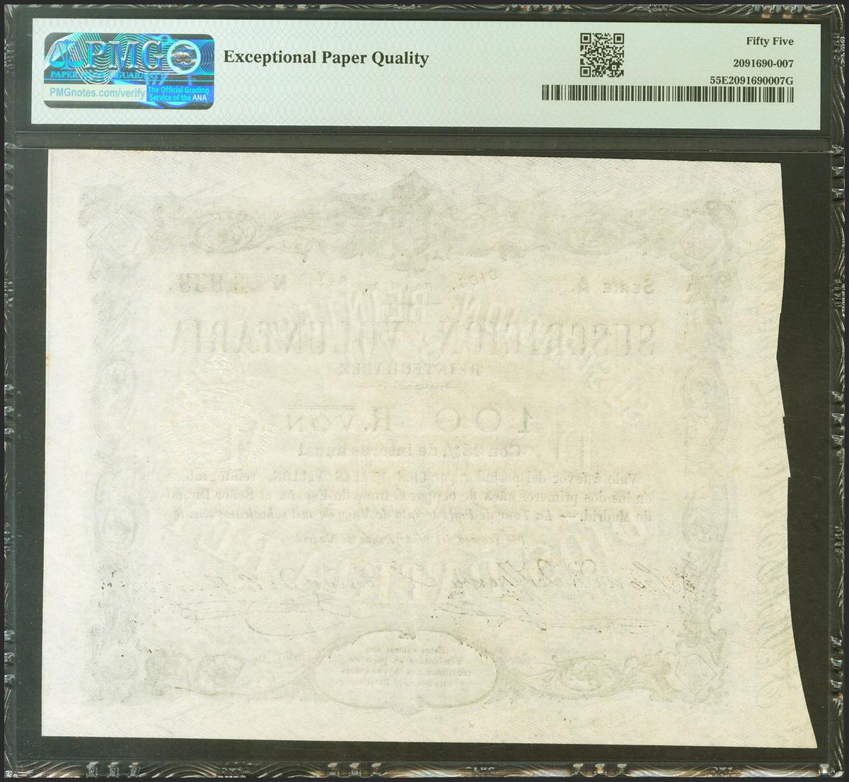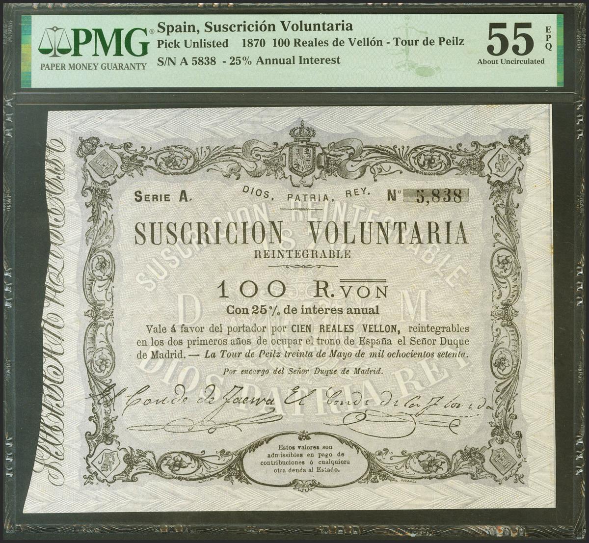 100 Reales de Vellón. 30 de Mayo de 1870. Emisión de Tour de Peilz. Serie A. (Edifil 2021: 196). Apresto original. EBC+. Encapsulado PMG55EPQ.