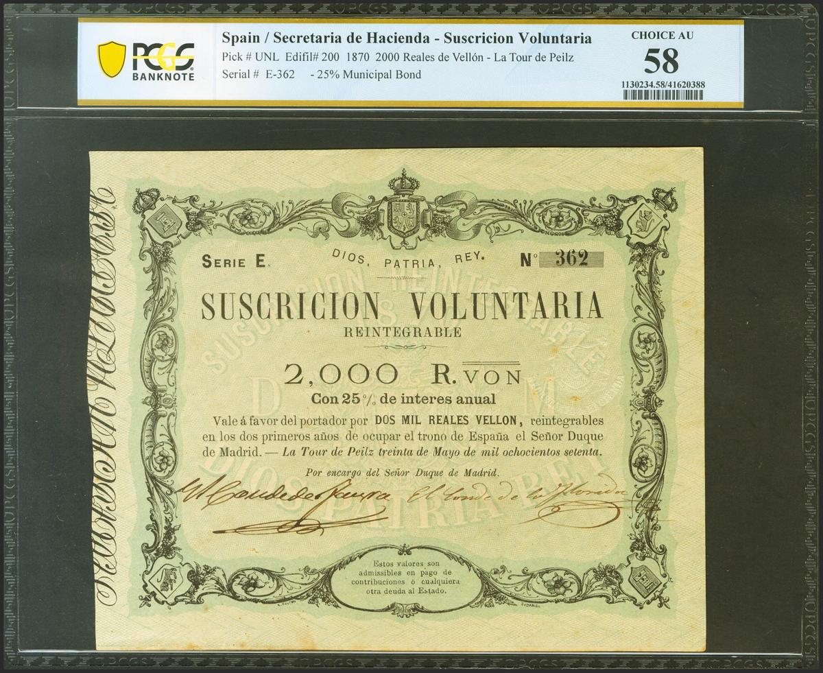 2000 Reales de Vellón. 30 de Mayo de 1876. Emisión Tour de Peilz. Serie E. (Edifil 2017: 200). Rarísimo. EBC+++. Encapsulado PCGS58 (minor stains).