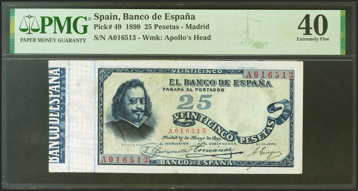 25 Pesetas. 17 de Mayo de 1899. Serie A. (Edifil 2021: 306, Pick: 49). Raro en esta conservación, especialmente sin ningún tipo de reparaciones. EBC. Encapsulado PMG40