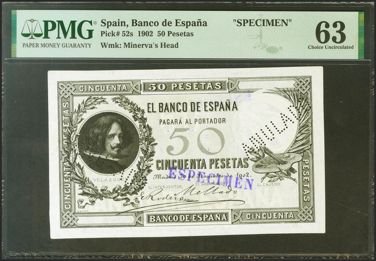 Prueba (anverso y reverso) del billete de 50 Pesetas emitido el 30 de Noviembre de 1902. Perforación ANULADO, marca ESPECIMEN y sin la firma del cajero. (Edifil 2021: 309P, Pick: 52s). Rarísimo. SC-. Encapsulado PMG63.