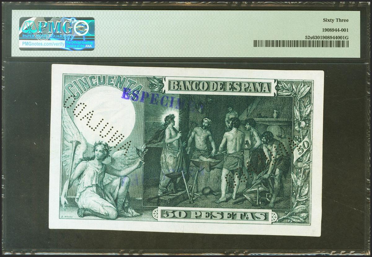 Prueba (anverso y reverso) del billete de 50 Pesetas emitido el 30 de Noviembre de 1902. Perforación ANULADO, marca ESPECIMEN y sin la firma del cajero. (Edifil 2021: 309P, Pick: 52s). Rarísimo. SC-. Encapsulado PMG63.
