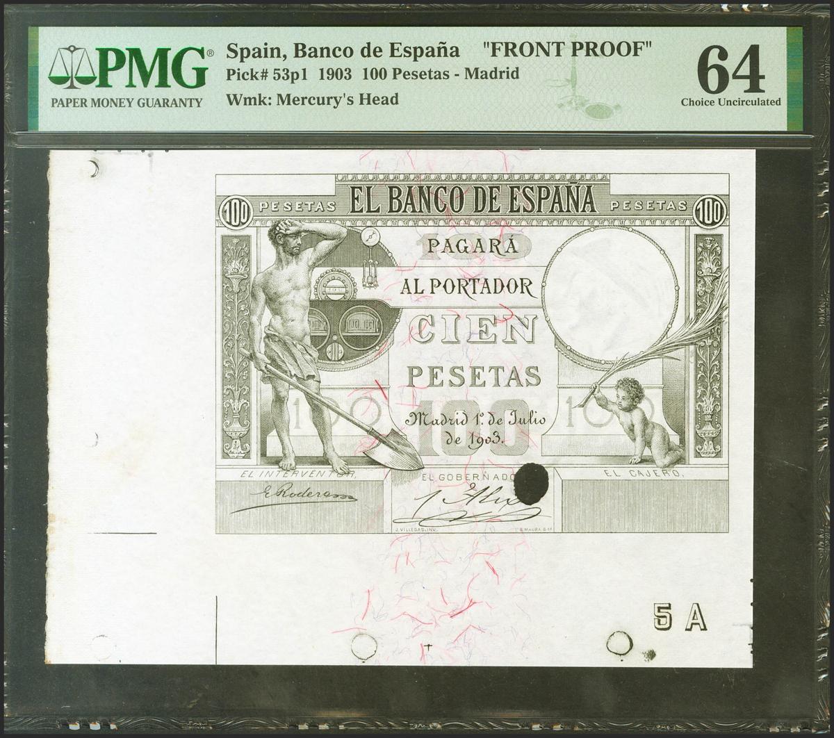 100 Pesetas. 1 de Julio de 1903. Prueba de anverso y sin numeración. (Edifil 2021: 310P, Pick: 53p1). Inusual, esquina de pliego. Encapsulado PMG64.