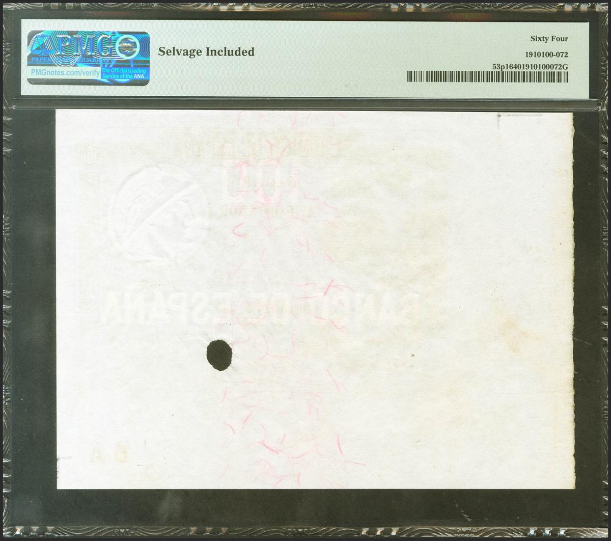 100 Pesetas. 1 de Julio de 1903. Prueba de anverso y sin numeración. (Edifil 2021: 310P, Pick: 53p1). Inusual, esquina de pliego. Encapsulado PMG64.