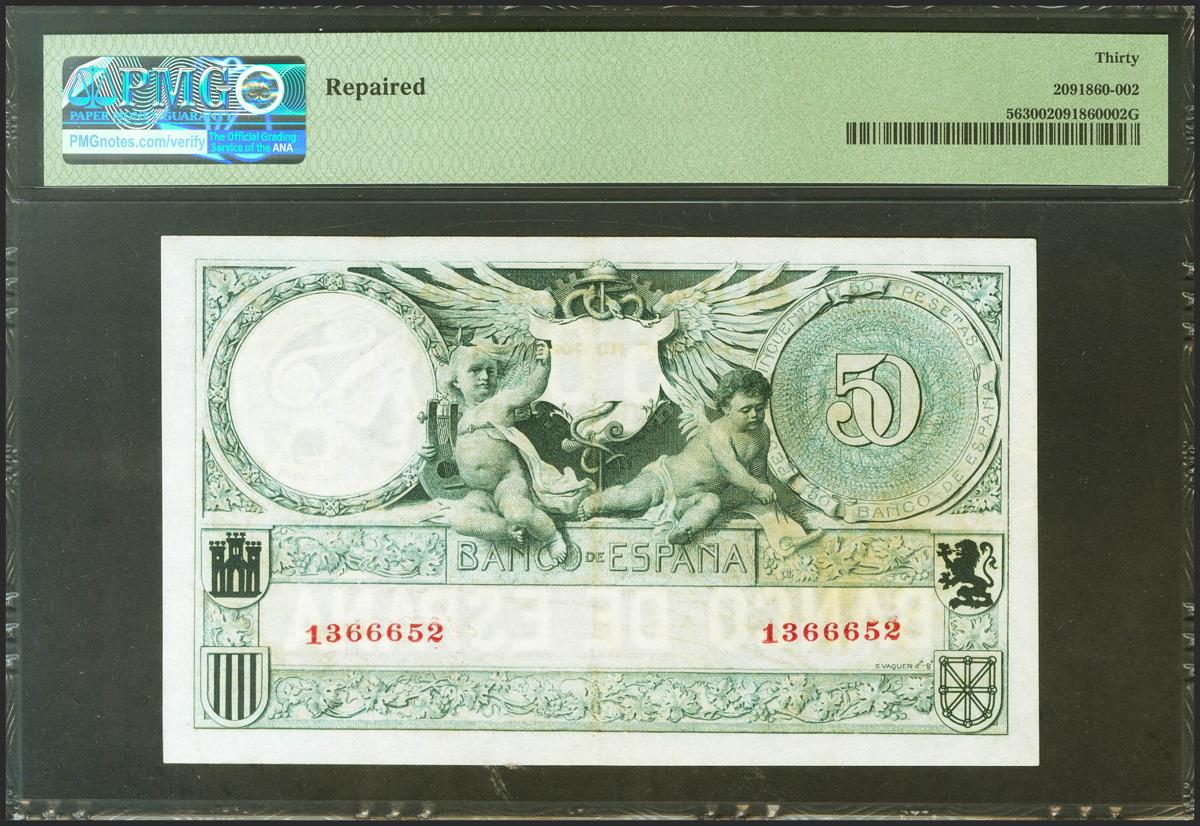 50 Pesetas. 19 de Marzo de 1905. Sin serie. (Edifil 2021: 312, Pick: 56). Raro, mínimamente reparado. MBC+. Encapsulado PMG30.