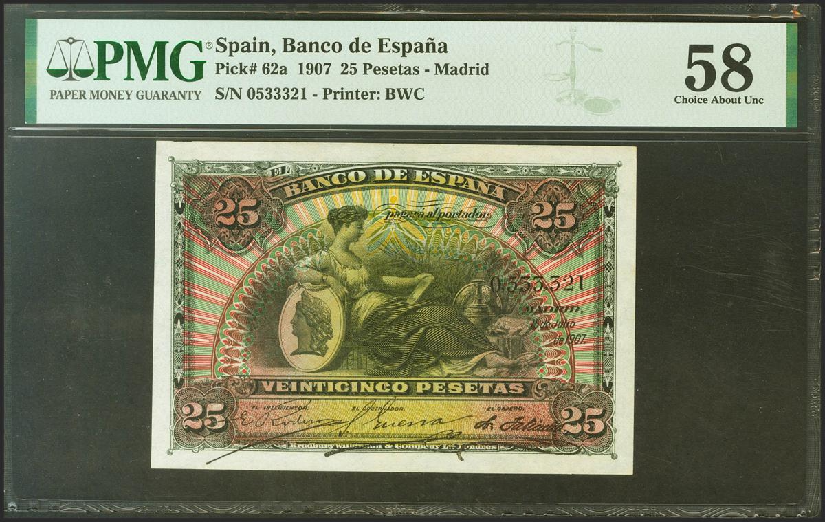 25 Pesetas. 15 de Julio de 1907. Sin serie. (Edifil 2021: 318, Pick: 62a). Muy raro en esta calidad. EBC+. Encapsulado PMG58. (para hacernos idea de la rareza, a fecha 1 de Marzo de 2023, este billete es el séptimo mejor calificado junto a otros tres billetes en PMG)