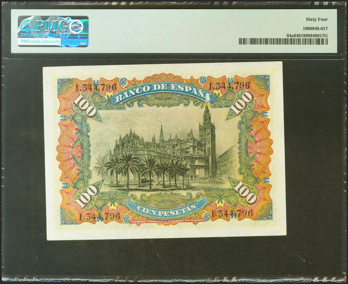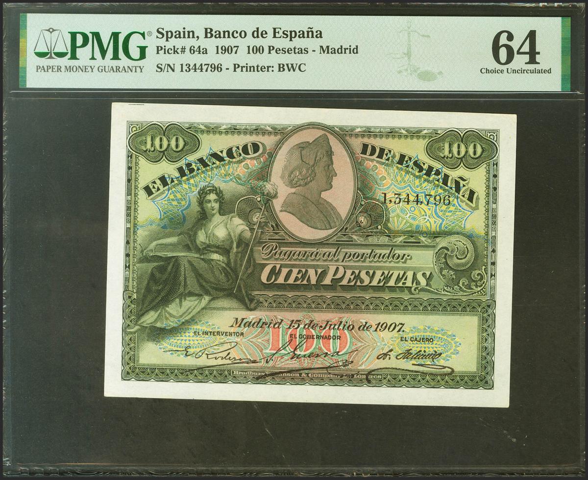 100 Pesetas. 15 de Julio de 1907. Sin serie. (Edifil 2021: 320, Pick: 64a). Raro, especialmente en esta calidad. SC. Encapsulado PMG64.
