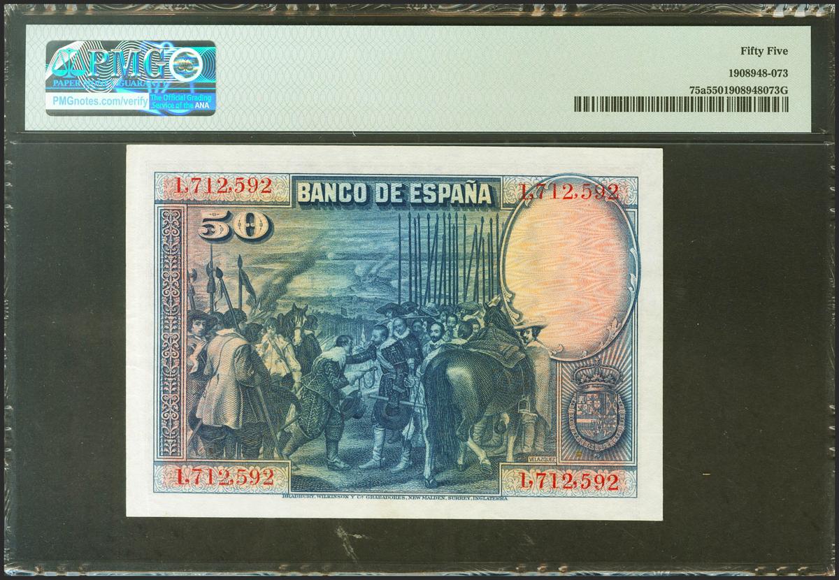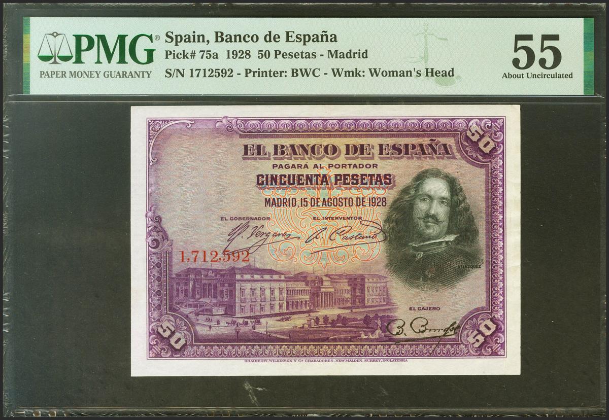 50 Pesetas. 15 de Agosto de 1928. Sin serie. (Edifil 2021: 329, Pick: 75a). Inusual, especialmente en esta calidad. EBC+. Encapsulado PMG55.