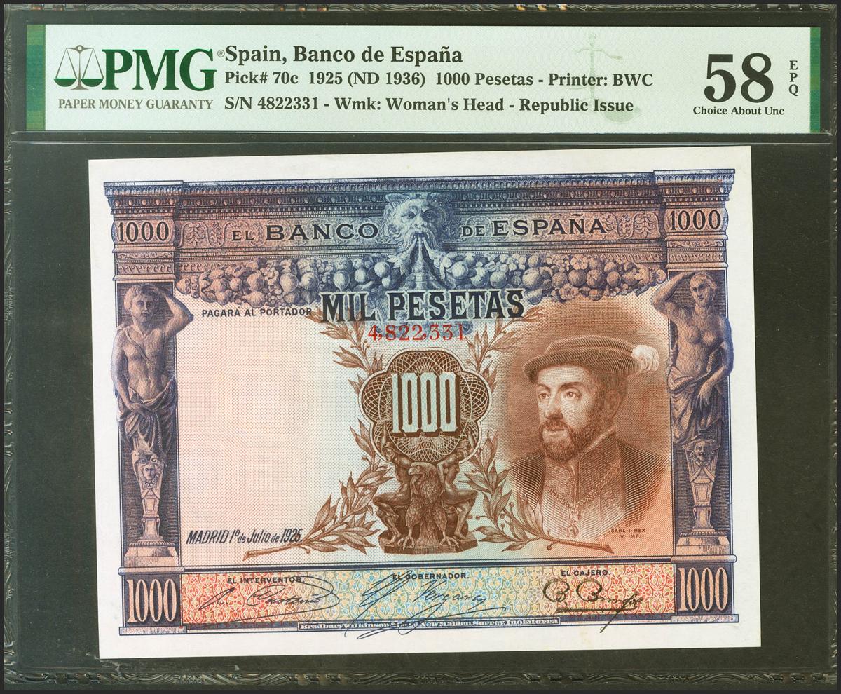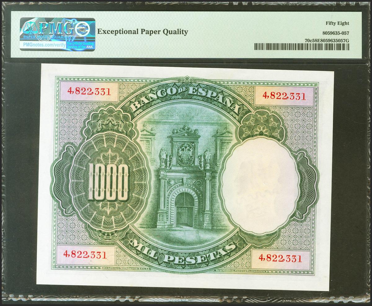 1000 Pesetas. 1 de Julio de 1925. Sin serie y numeración posterior al 3646000. (Edifil 2021: 351, Pick: 70c). Inusual en esta calidad, apresto original. EBC+++. Encapsulado PMG58EPQ.