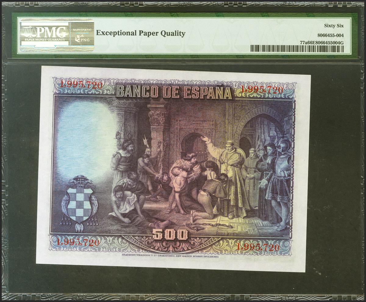 500 Pesetas. 15 de Agosto de 1928. Sin serie. (Edifil 2021: 356, Pick: 77a). Raro en esta excepcional calidad, apresto original. SC. Encapsulado PMG66EPQ.