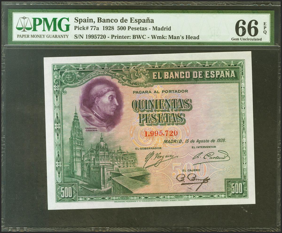 500 Pesetas. 15 de Agosto de 1928. Sin serie. (Edifil 2021: 356, Pick: 77a). Raro en esta excepcional calidad, apresto original. SC. Encapsulado PMG66EPQ.