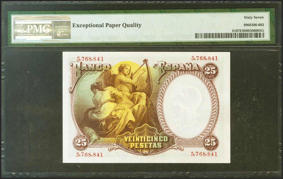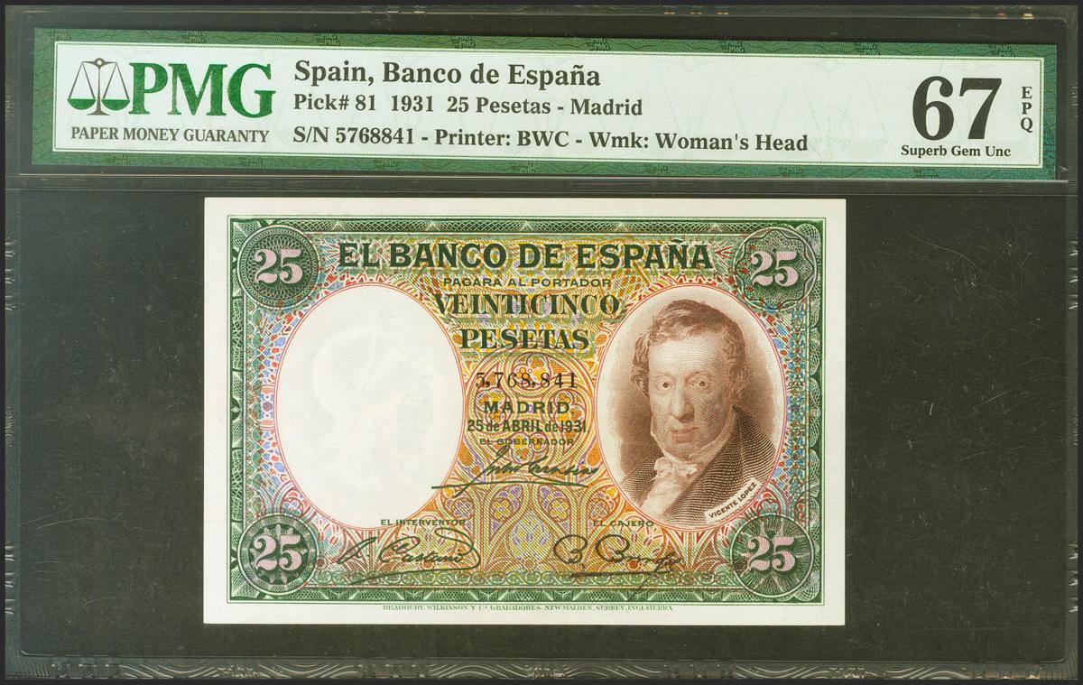 25 Pesetas. 25 de Abril de 1931. Sin serie. (Edifil 2021: 358, Pick: 81). Rarísimo en esta excepcional calidad, apresto original. SC. Encapsulado PMG67EPQ.