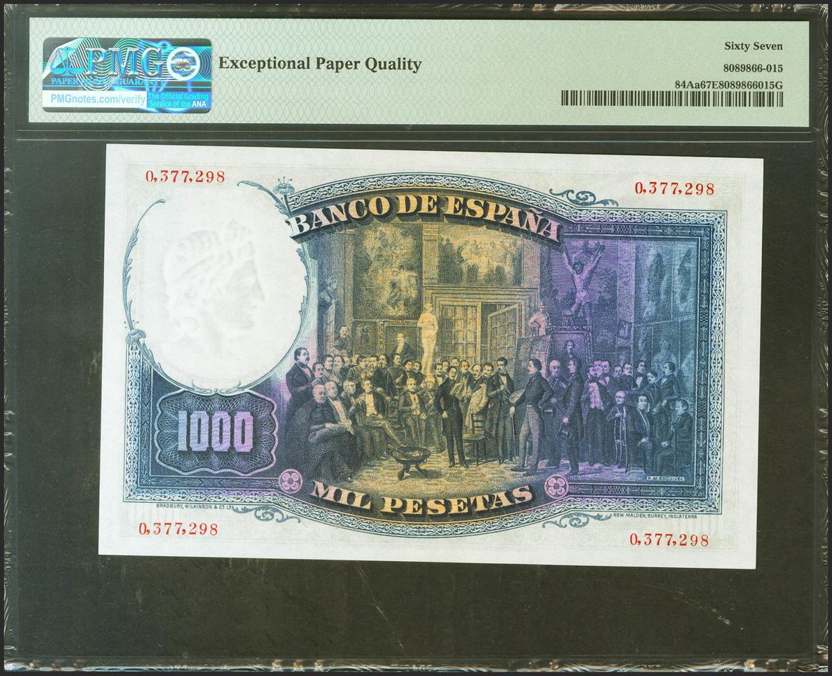 1000 Pesetas. 25 de Abril de 1931. Sin serie. (Edifil 2021: 362, Pick: 84Aa). Extraordinariamente raro en esta calidad, apresto original. SC. Encapsulado PMG67EPQ. (para hacernos idea de la rareza, a fecha 1 de Marzo de 2023, este billete es el mejor calificado junto a otros cuatro billetes en PMG)