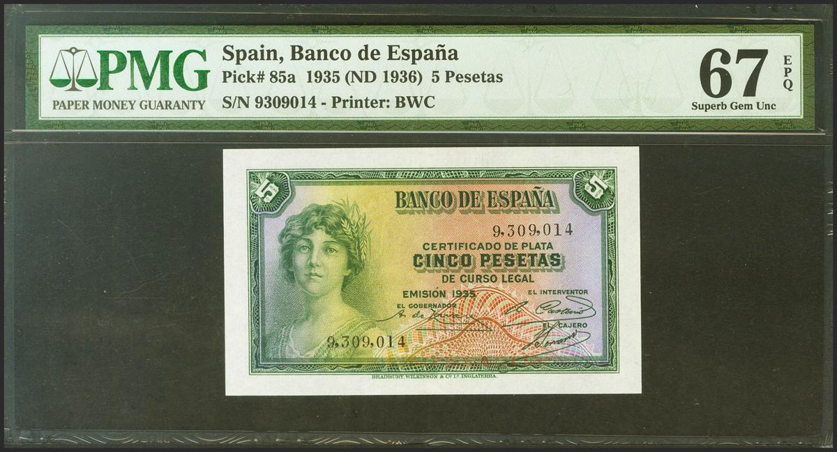 5 Pesetas. 1935. Certificado de Plata. Sin serie. (Edifil 2021: 363, Pick: 85a). Raro en esta excepcional calidad, apresto original. SC. Encapsulado PMG67EPQ