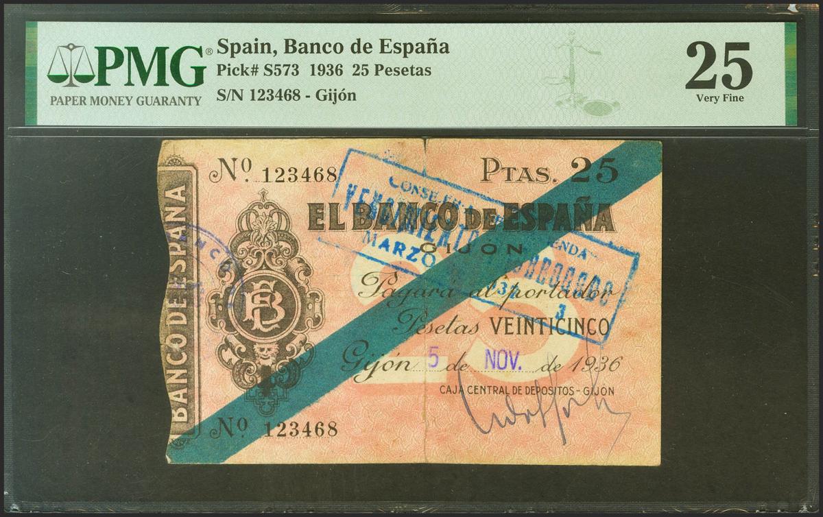 25 Pesetas. 5 de Noviembre de 1936. Sucursal de Gijón. Sin serie. (Edifil 2021: 382, Pick: S573). Raro. MBC+. Encapsulado PMG25.