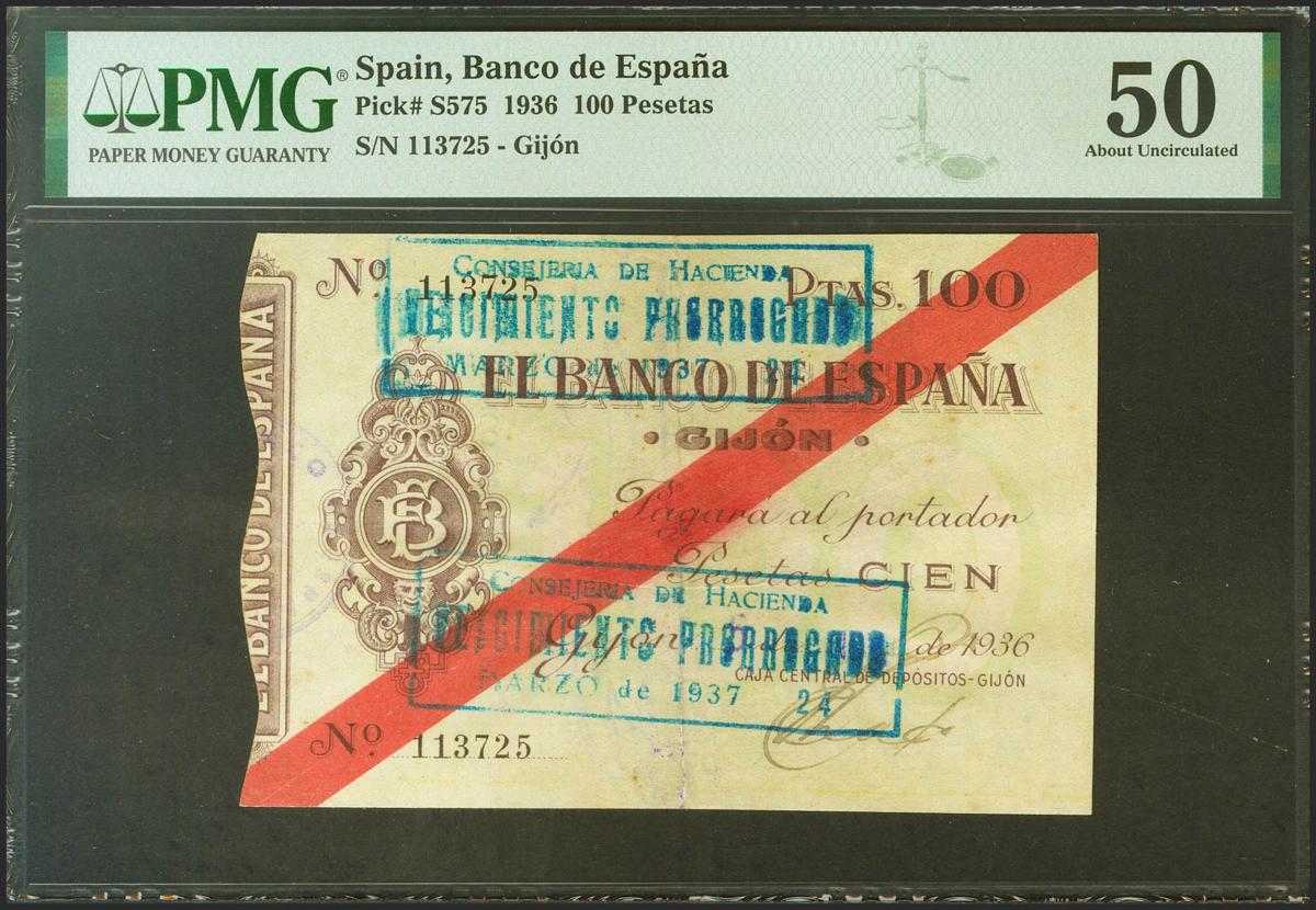 100 Pesetas. 1936. Banco de Gijón. (Edifil 2021: 384, Pick: S575). Raro en esta calidad, mínimamente reparado. EBC. Encapsulado PMG50.
