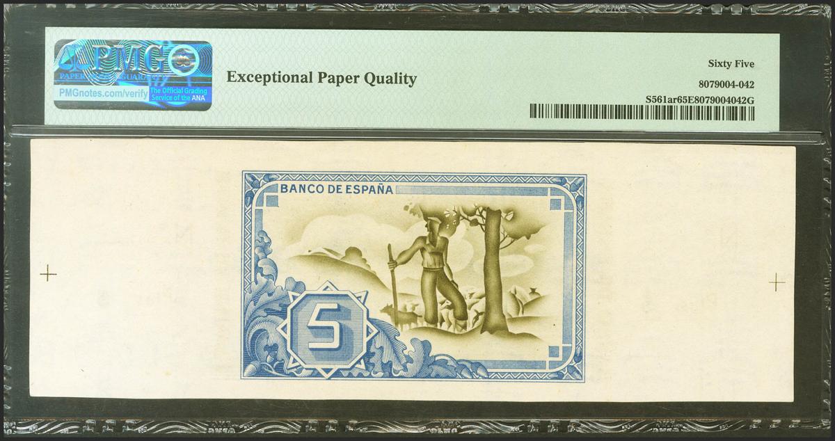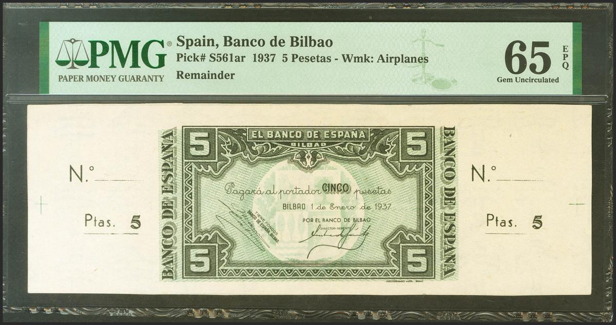 5 Pesetas. 1 de Enero de 1937. Sucursal de Bilbao, antefirma Banco de Bilbao. Sin serie y sin numeración, con ambas matrices. (Edifil 2021: 385c, Pick: S561ar). Apresto original. SC. Encapsulado PMG65EPQ.
