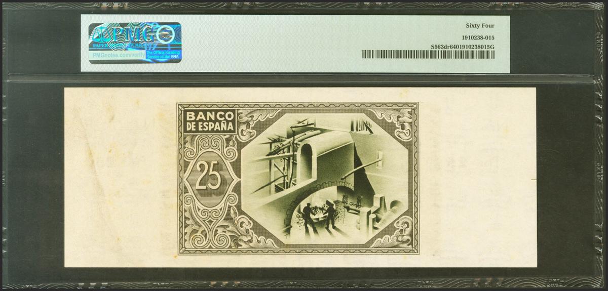 25 Pesetas. 1 de Enero de 1937. Sucursal de Bilbao, antefirma Banco Hispano Americano. Sin serie y sin numeración, con ambas matrices. (Edifil 2021: 388f, Pick: S563dr). SC. Encapsulado PMG64.