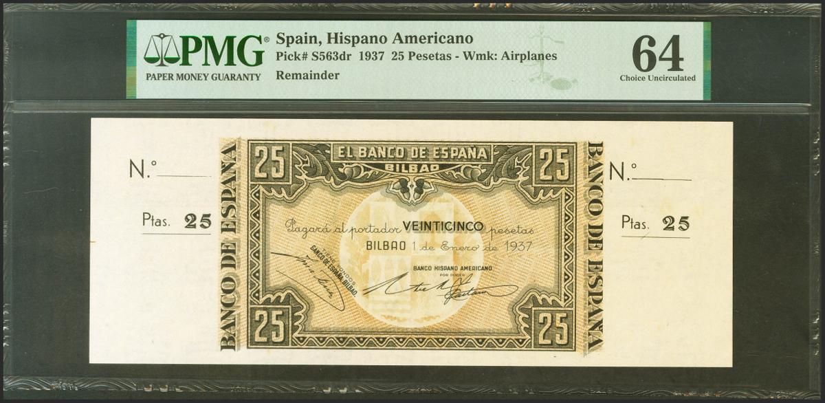 25 Pesetas. 1 de Enero de 1937. Sucursal de Bilbao, antefirma Banco Hispano Americano. Sin serie y sin numeración, con ambas matrices. (Edifil 2021: 388f, Pick: S563dr). SC. Encapsulado PMG64.